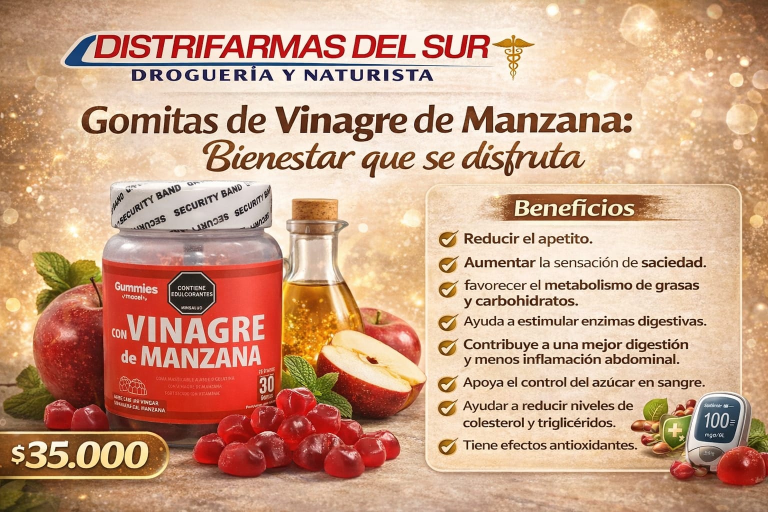 Gomitas de vinagre de manzana, reduce el apetito, aumenta la sensación de saciedad, favorece el metabolismo de grasas y carbohidratos.